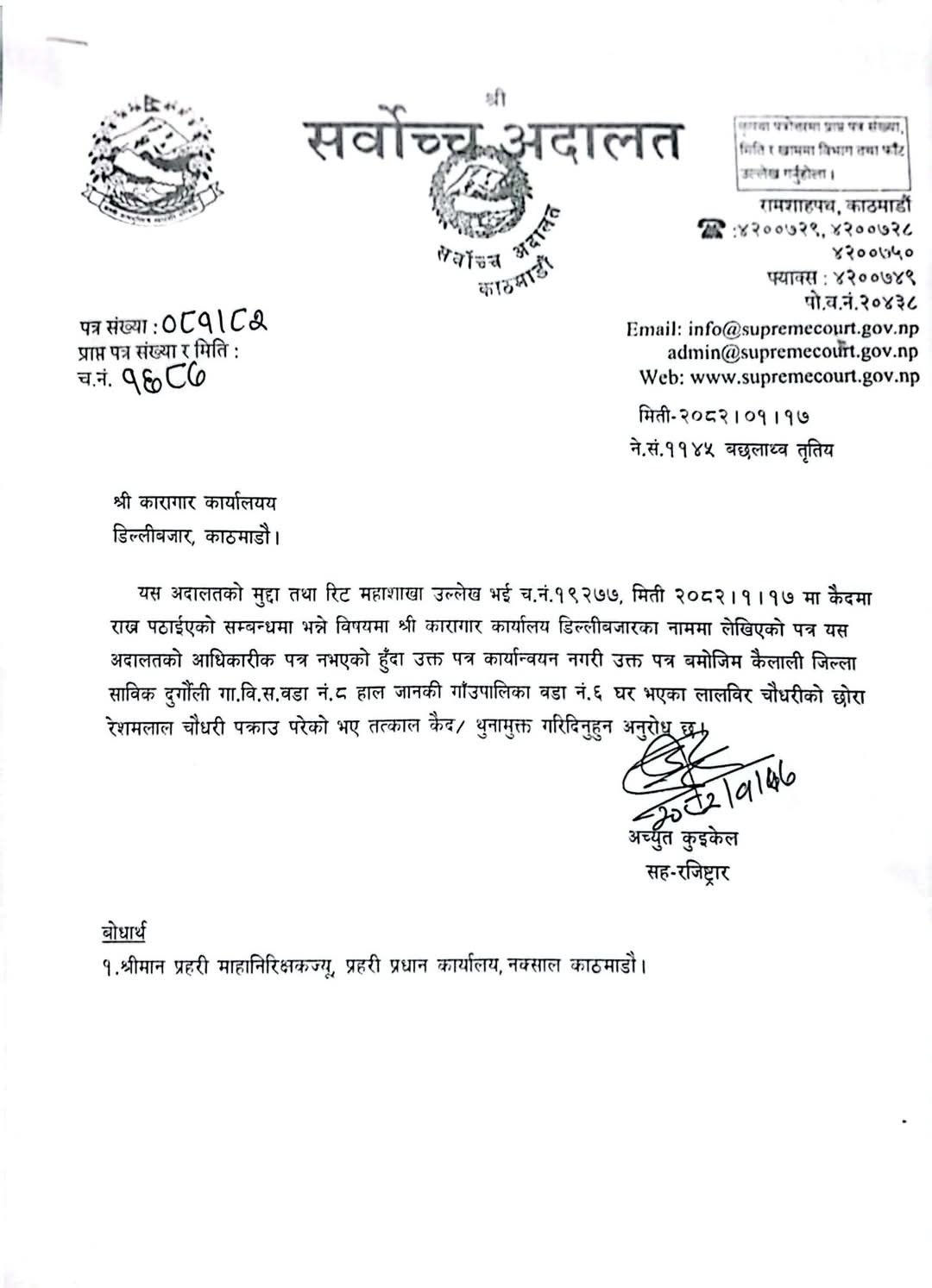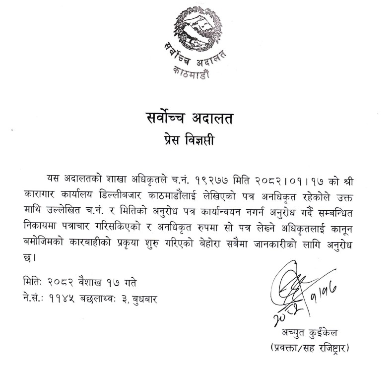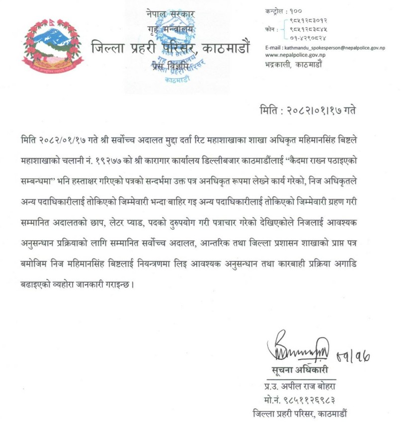 तर पछि पत्र नै सार्वजनिक भएपछि थाहा भयो, आइजीले त गलत सूचना दिएका रहेछन्। सर्वोच्च अदालतको फैसला कार्यान्वयन इकाईको हैन, मुद्दा तथा रिट महाशाखाको पत्र रहेछ त्यो त। कहाँको पत्र, के पत्र- व्यहोरा नै नहेरी समात्न कुदिदिएको प्रहरी अनि ?