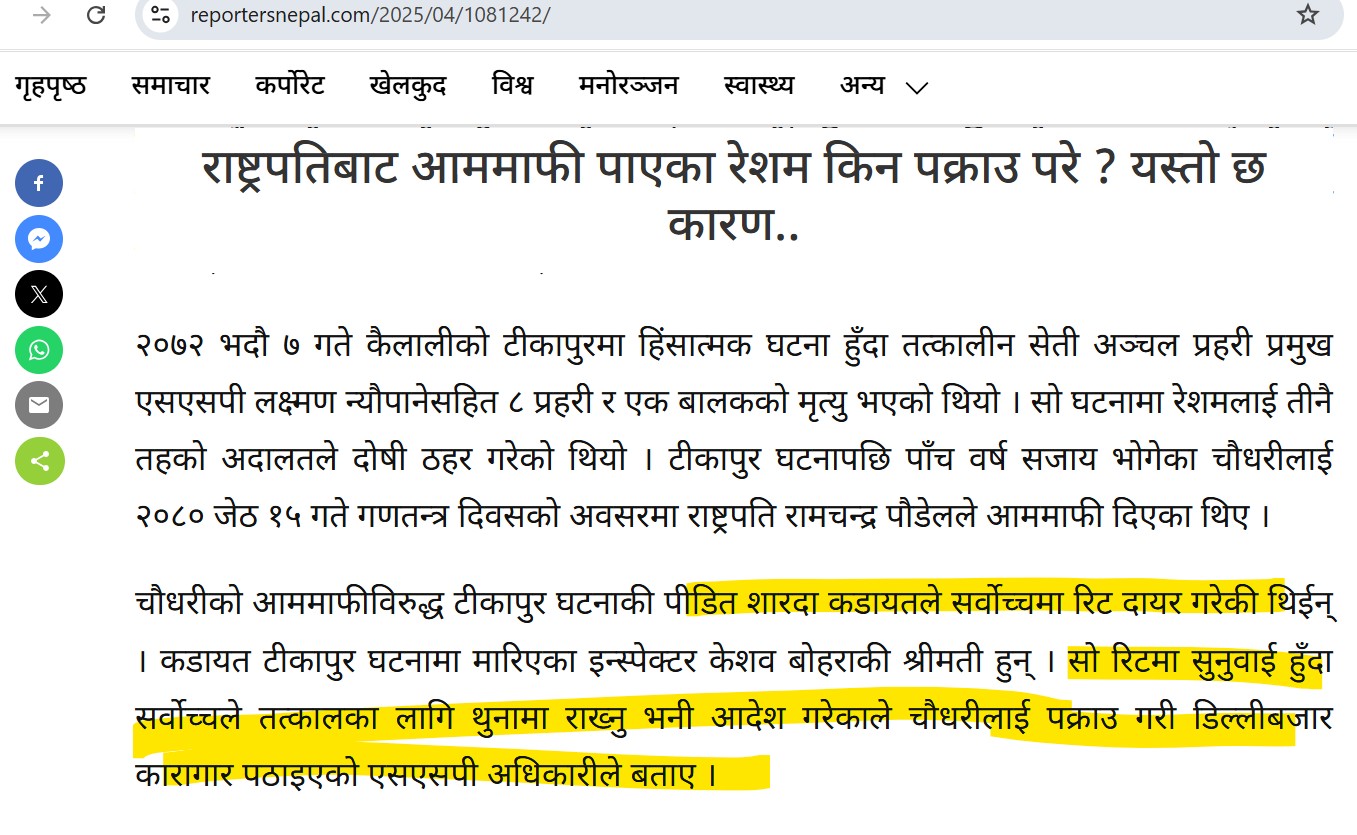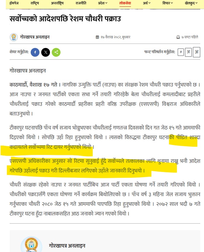 समाचारको अन्तिम लाइनमा शारदा कडायतले सर्वोच्च रिट दायर गरेको र त्यही रिटमा सर्वोच्चले आममाफीको फैसला उल्ट्याइदिएको दावी गरिएको छ।