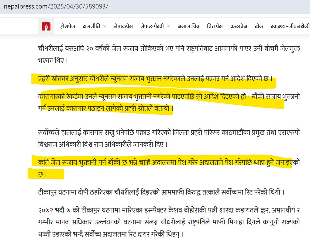 कान्तिपुरको प्रहरी स्रोत बारे त माथि लेखिसकियो नै। अब पालो नेपालप्रेसको प्रहरी स्रोतको। यसले झन् अनौठो खुलासा गरेछ। के भने नि, कारागारको रेकर्डमा उनले न्यूनतम सजाय भुक्तानी नगरेको पाइयो रे, त्यसपछि त्यस्तो आदेश दिइएको रे। बाँकी सजाय भुक्तानी गर्न उनलाई कारागार पठाइन लागेको प्रहरी स्रोतले बतायो पो रे।