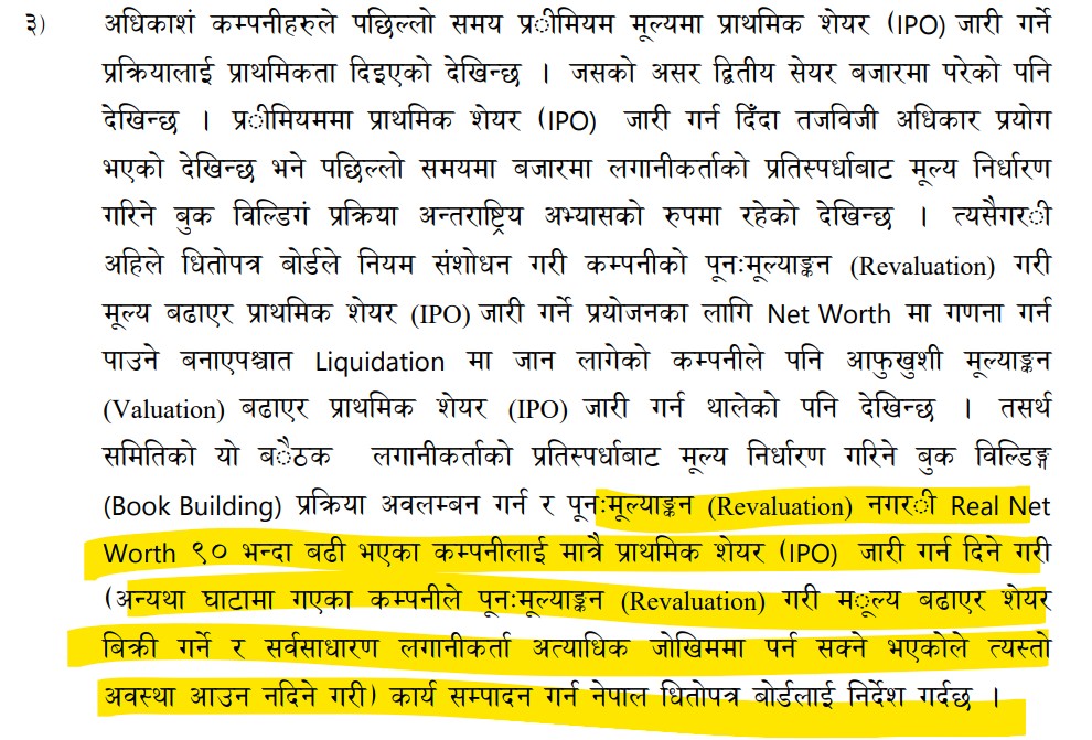 २०८० सालको पुस १२ गते सार्वजनिक लेखा समितिको बैठकले पछिल्लो समय आईपीओ निष्कासनमा बेथिति भएको भनेर सार्वजनिक लेखा समितिले ९० रुपैयाँभन्दा बढी नेटवर्थ भएका कम्पनीलाई मात्रै प्राथमिक सेयर जारी गर्न दिने गरी कार्य सम्पादन गर्न धितोपत्र बोर्डलाई निर्देशन दिएको थियो।