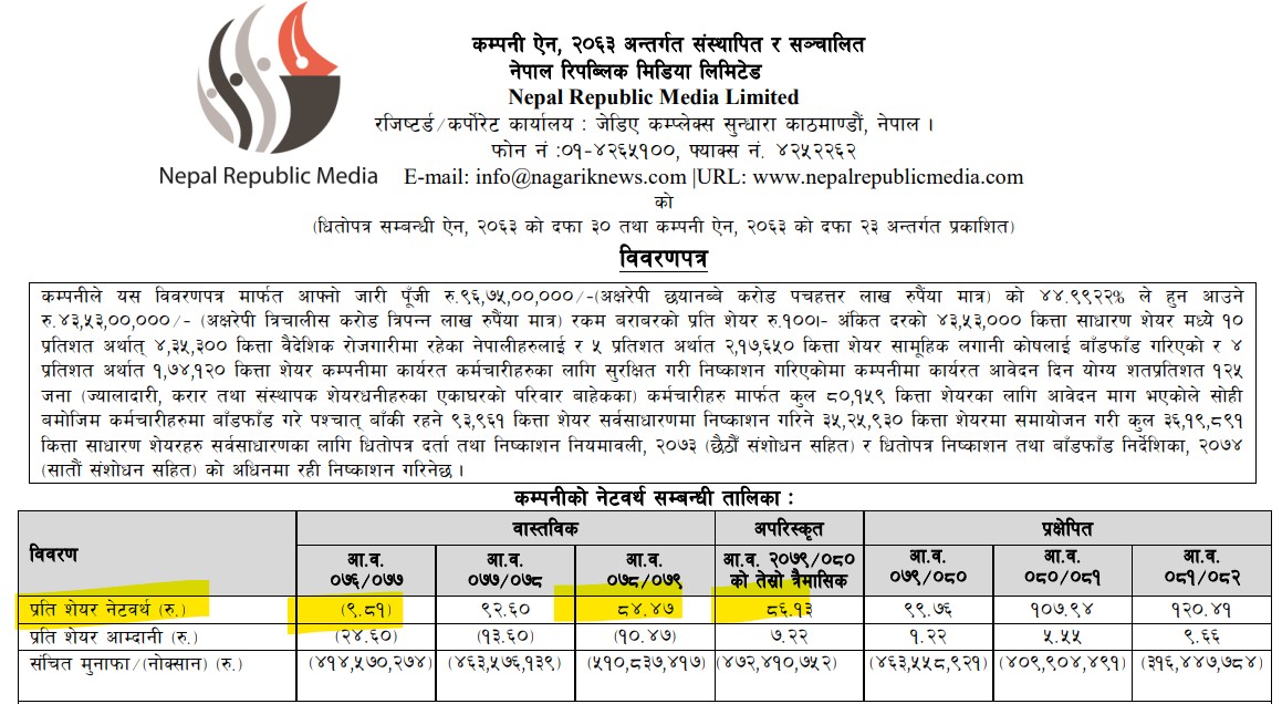 त्यसो भए यसअघि आइपिओ निकालिसकेको नेपाल रिपब्लिक मिडियाको नेटवर्थ कति थियो त ? हेरौँ त्यतिबेला कम्पनीले सार्वजनिक गरेको विवरणपत्र-