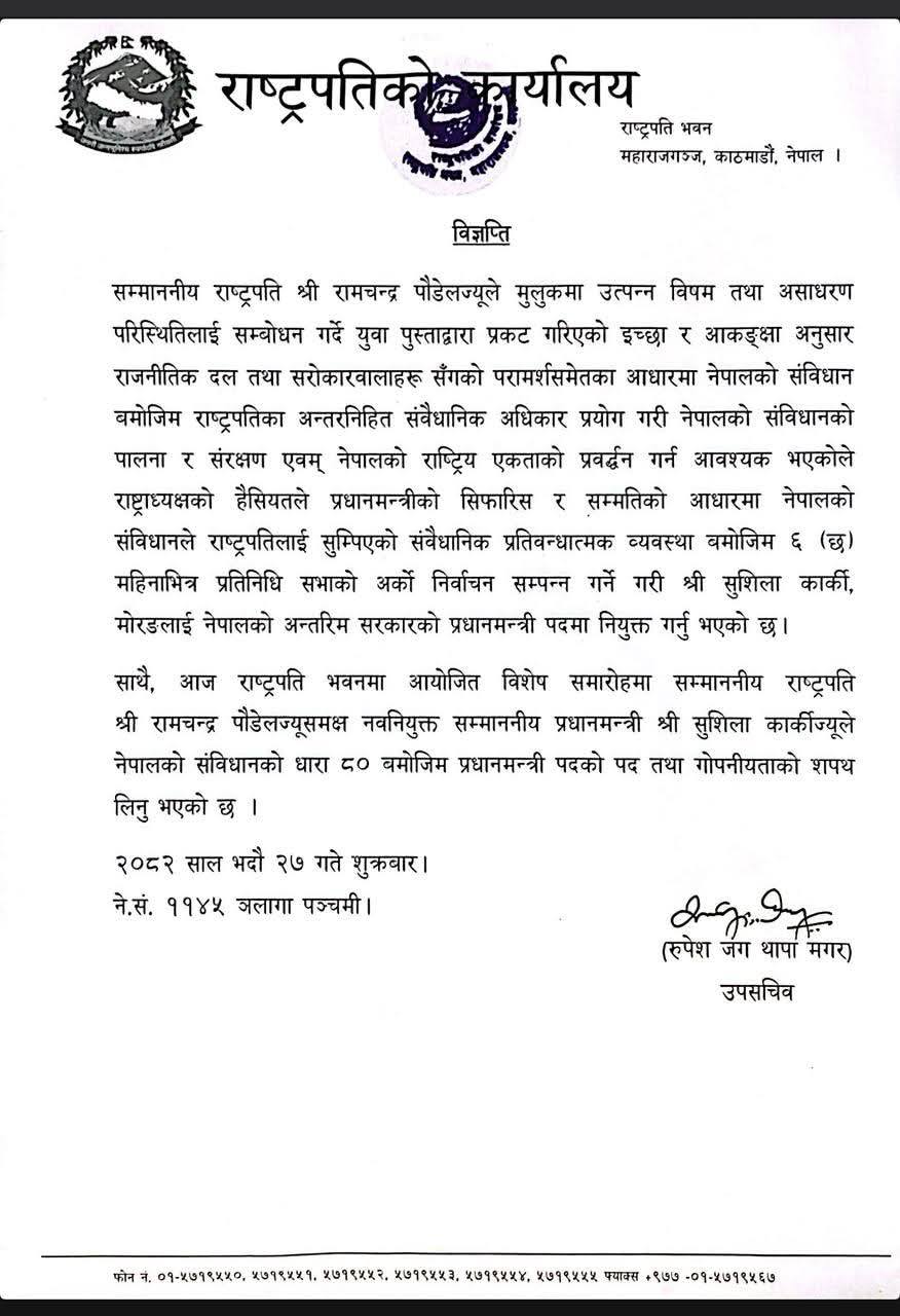 संविधानले संसद बाहिरको प्रधानमन्त्री नियुक्त हुने कल्पना नगरेको भए पनि आन्दोलनको बलमा प्रधानमन्त्री नियुक्त भएकोले विज्ञप्तिमा संविधानको धारा उल्लेख गरिएको छैन।