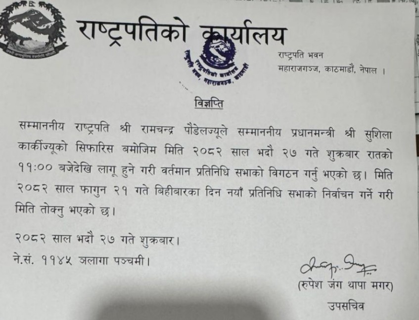 विज्ञप्ति अनुसार राति ११ बजेदेखि लागू हुने गरी प्रतिनिधि सभा विघटन भएको छ भने फागुन २१ गते चुनाव हुने भएको छ।
