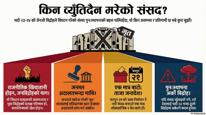सूर्य खड्का – मरेको लासले जसरी पुनर्जन्म पाउँदैन, आध्यात्मिक रूपमा चोला फेर्ला, त्यो अर्कै पाटो हो। त्यस्तै, जेनजी आन्दोलन २०८२ को दबाबमा विघटित प्रतिनिधि सभा पनि अब पुनःस्थापित हुन सक्दैन। यो राजनीतिक रूपमा जनविद्रोहद्वारा अस्वीकृत, कानुनी हिसाबमा संविधानभन्दा बाहिरबाट खोजिएको विकल्प मात्रै होइन, जेनजी आन्दोलनको आलोकमा खारेज भइसकेको मृत संस्था हो। जीवित प्राणी मरेझैँ जनविद्रोहको… Continue reading